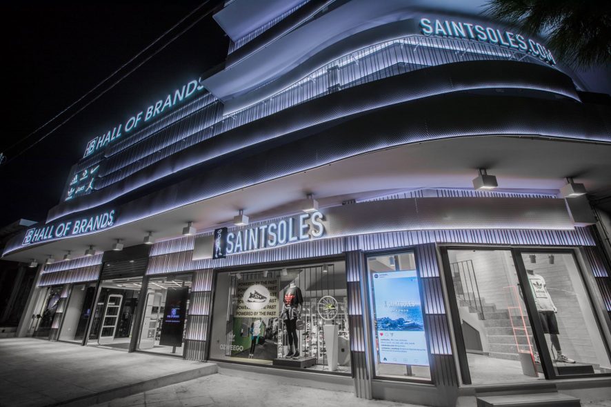 Από τις 10 Σεπτεμβρίου κάτι έχει αλλάξει στην πλατεία Εσπερίδων. Θα το αντιληφθείς όποια ώρα κι αν περάσεις, αλλά ειδικά μετά το σούρουπο η εικόνα είναι πραγματικά εντυπωσιακή. Τα φώτα του Hall of Brands και του Saintsoles, του ολοκαίνουριου αθλητικού και casual superstore της Γλυφάδας, δίνουν σε ολόκληρη την περιοχή τον τόνο μιας νέας εποχής. Η οδός Γιαννιτσοπούλου πλημμυρίζει καθημερινά από ανθρώπους που κρατούν τις χαρακτηριστικές λευκές και μαύρες τσάντες με το λογότυπο του καταστήματος. Οι περαστικοί ρίχνουν κλεφτές ματιές στο εσωτερικό του. Κάποιοι μπαίνουν μέσα από περιέργεια, απλώς και μόνο για να το εξερευνήσουν. Στην κορυφή του, επίσης φωτισμένη, στέκει ακόμα η ιστορική επιγραφή: ΑΝΝΑ ΝΤΟΡ.