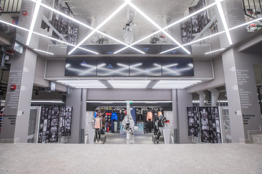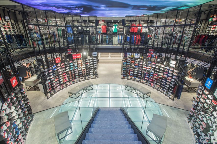 1. Το Hall of Brands το κατάστημα στο οποίο θα μπεις απευθείας αν διαλέξεις την αριστερή είσοδο, είναι αφιερωμένο στο performance και athleisure στυλ, με γυναικείο, ανδρικό και παιδικό τμήμα αλλά και εξειδικευμένα corners για μπάσκετ, ποδόσφαιρο, τένις, κολύμβηση, indoor και outdoor. Η καρδιά του βέβαια θα έλεγε κανείς πως χτυπά στην οροφή του. Εκεί, πάνω από την αναδιαμορφωμένη πλατεία και τον εξώστη του Άννα Ντορ, βρίσκεται το τεράστιο led wall (το πρώτο οβάλ led wall οροφής στα Βαλκάνια) που σίγουρα θα χαζέψεις για αρκετή ώρα αν μπαίνεις για πρώτη φορά στον ανακαινισμένο χώρο.