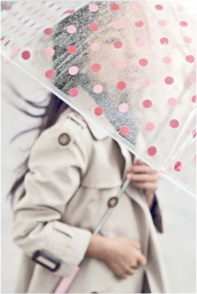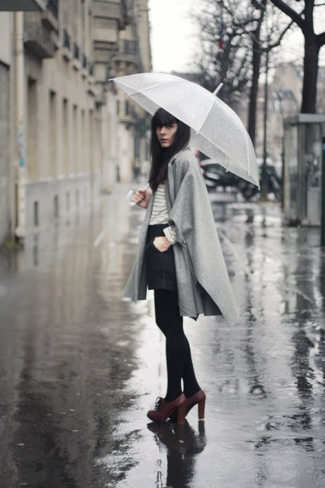 Με τόση βροχή με το τουλούμι που έφαγα ως μόνιμη κάτοικος Παρισιού μου αρέσει η βροχή μόνο υπό δυο όρους. 1. Να μη δουλεύω και γενικά να μην υπάρχει κανένας απολύτως λόγος να βγω από το σπίτι και 2. Να μπορώ όλη μέρα να μεταφέρομαι από το κρεβάτι στον καναπέ και τούμπαλιν με ζεστό τσάι με μέλι, cookies και ανελέητο cocooning με το Je t’aime. Δυστυχώς αυτό το σενάριο σπάνια παίζεται στην πραγματική ζωή (συνεχώς κάτι θα λείπει, μια η αργία, μια το je t’aime, άλλη τα cookies). Με τόση βροχή δε, που έχει ρίξει φέτος (καλά στο Παρίσι αλλά και στα Νότια;) αν βάλεις όλες μαζί τις μη βροχερές μέρες θα είχαμε δουλέψει κάνα μήνα όλο κι όλο και τόσο σορολόπ δεν το βαστάει ούτε η τσέπη μας, ούτε η χώρα. Ας αφήσουμε τις δικαιολογίες λοιπόν (και πρώτη και καλύτερη εγώ!), ας ανασκουμπωθούμε και να εμπνευστούμε από μερικά σύνολα υπό βροχή.