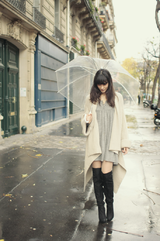 Ένα φορεματάκι με over-the-knee-boots και μάλλινη ζακέτα συνδυασμένη με διαφανή ομπρέλα.
