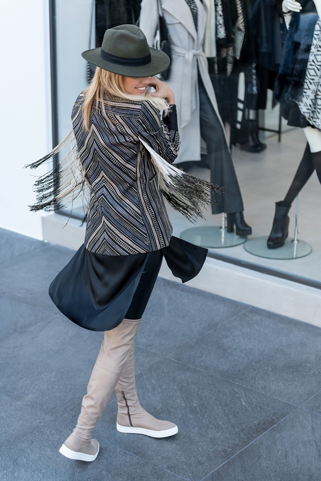 Αρχικά, η Έλενα έβαλε ένα εντυπωσιακό σακάκι NotAlone σε αποχρώσεις μαύρο – χρυσό και κρόσια στα μανίκια, μαζί με ένα μαύρο κολάν και τις ψηλές της μπότες. Με ένα τέτοιο look είναι φανερό πως όχι μόνο μπορείς να κλέψεις τις εντυπώσεις μα και να δεις η ίδια πως ένα κομμάτι ρούχου, όπως αυτό το jacket, μπορεί να κάνει την διαφορά. Αρκεί να είναι αρκετά ιδιαίτερο.