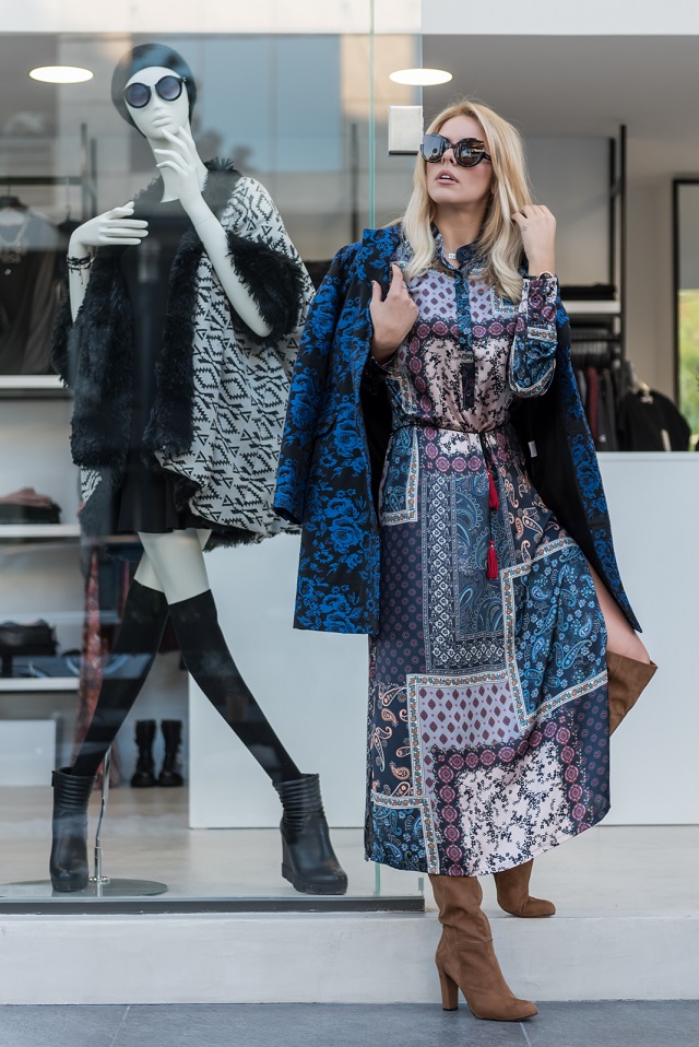 Συνεχίζοντας στο concept της ΝotAlone, το μακρύ boho print φόρεμα με το σκίσιμο στο πλάι και τις χρυσές φουντίτσες στο ανεπαίσθητο ζωνάκι, μοιάζει να συνδυάστηκε απίστευτα με ένα μπλε και μαύρο σακάκι του ιδίουbrand.