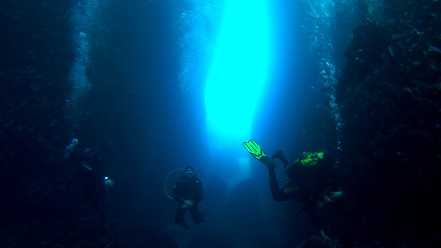 Πρόκειται για ένα κατακόρυφο σπήλαιο με βάθος τα 30 μέτρα. Υπάρχουν 2 τρύπες στα βράχια που αναβλύζουν ζεστό νερό (εξαιρετικό για spa diving!). Εκεί θα δεις χταπόδια, τρίτωνες, σπειρογράφους και άλλα. Μην περάσεις τα κάγκελα με την προειδοποιητική πινακίδα.