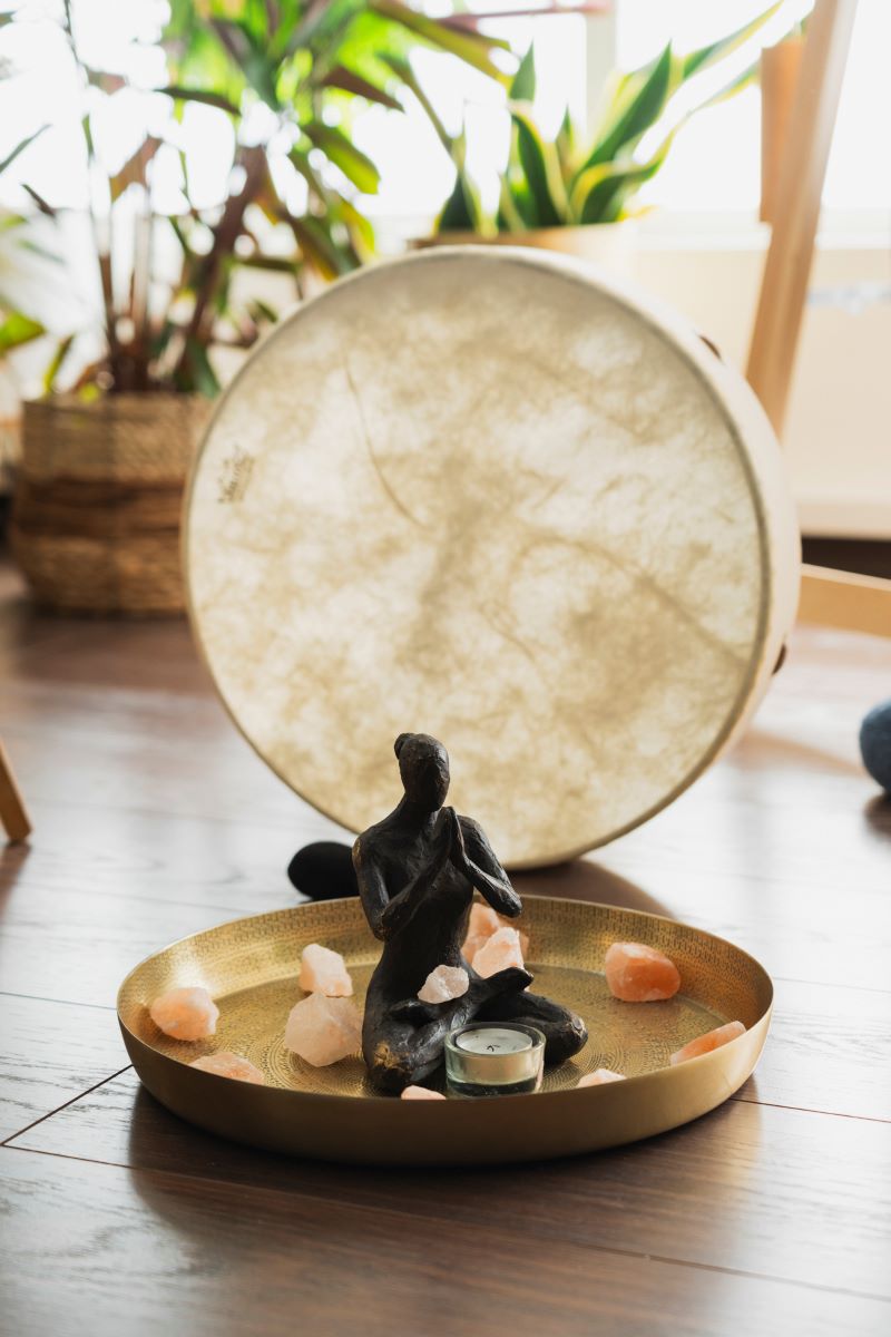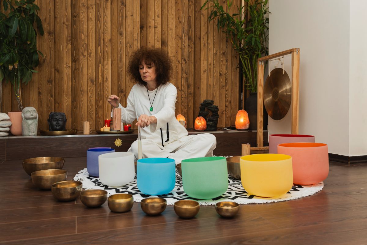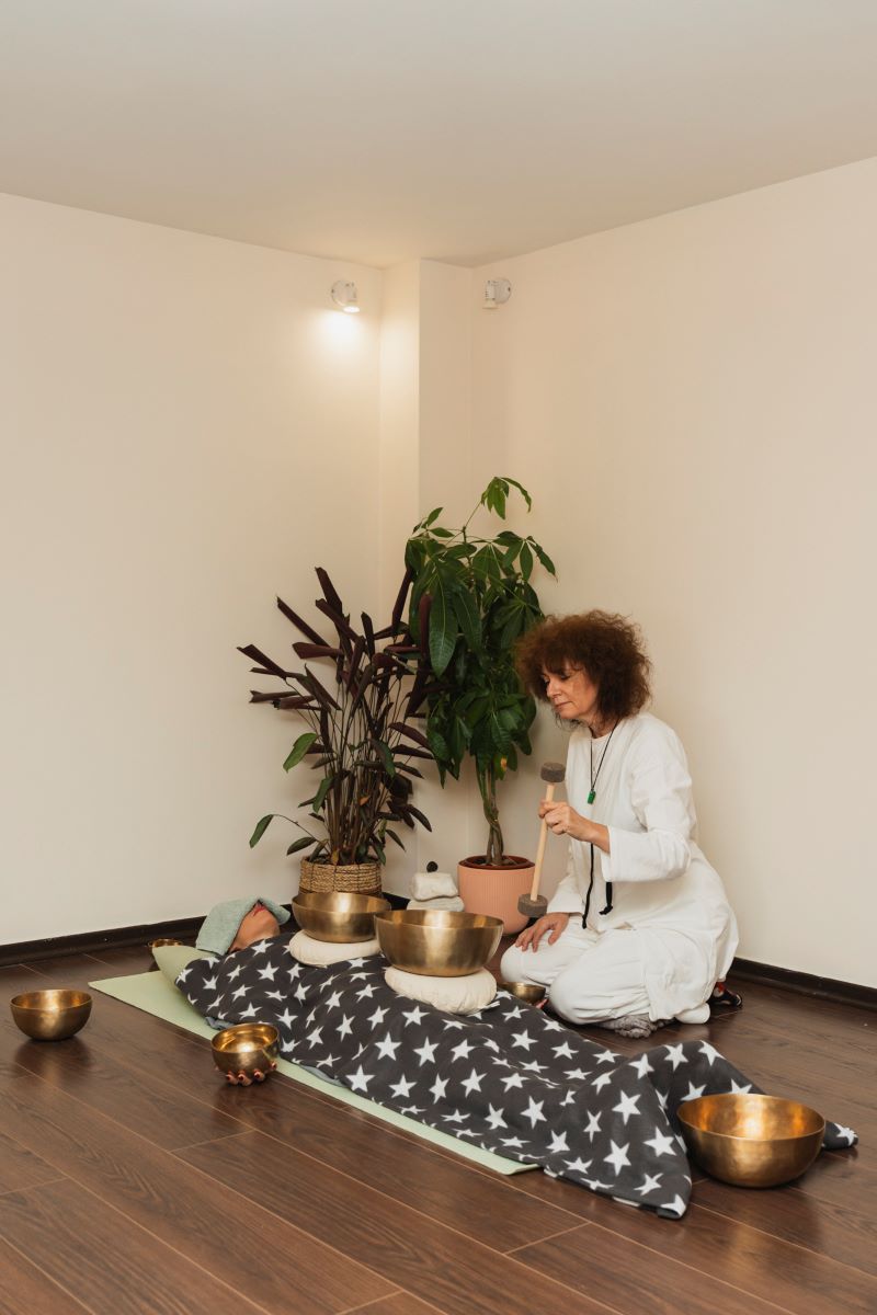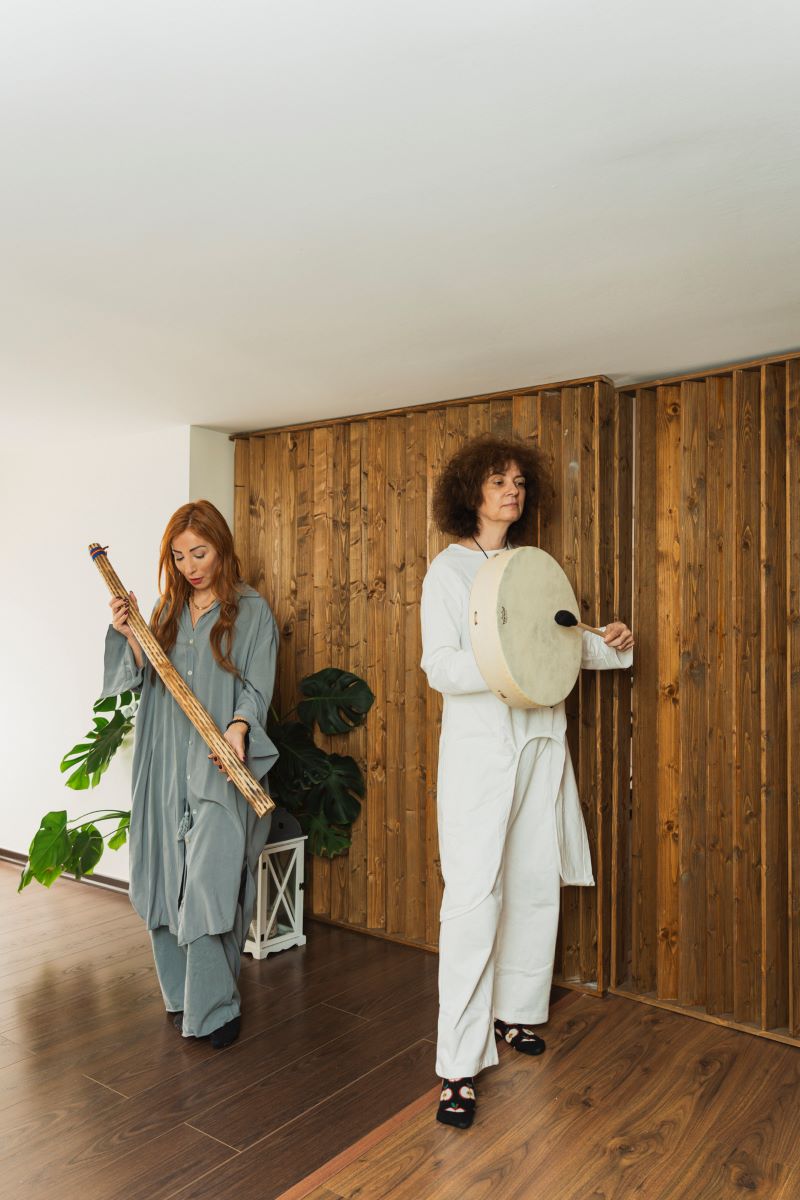 Καθ’ όλη τη διάρκεια της συνάντησης, ακούμε χαλαρωτικούς ήχους από ένα μεγάλο gong, θιβετιανά singing bowls, chimes, drums, monochord, rainstick και άλλα ηχητικά όργανα που υπάρχουν στην αίθουσα. Η Νατάσα (sound journey practitioner) τα χτυπάει με μαλέτες -έτσι λέγονται οι ξύλινοι ράβδοι- με διαφορετικό κάθε φορά τρόπο. Κάποιος ήχος είναι πιο δυνατός, κάποιος με μεγαλύτερη διάρκεια. Κάποιος με κάνει να αισθάνομαι δυνατή και άλλος χαλαρή. Όπως μας ενημερώνει, οι δονήσεις αυτού του Sound Bath δρουν άμεσα στο νευρικό σύστημα, βοηθώντας το σώμα να απελευθερώσει την ένταση και να μπει σε μια κατάσταση βαθιάς χαλάρωσης και εσωτερικής αρμονίας.
