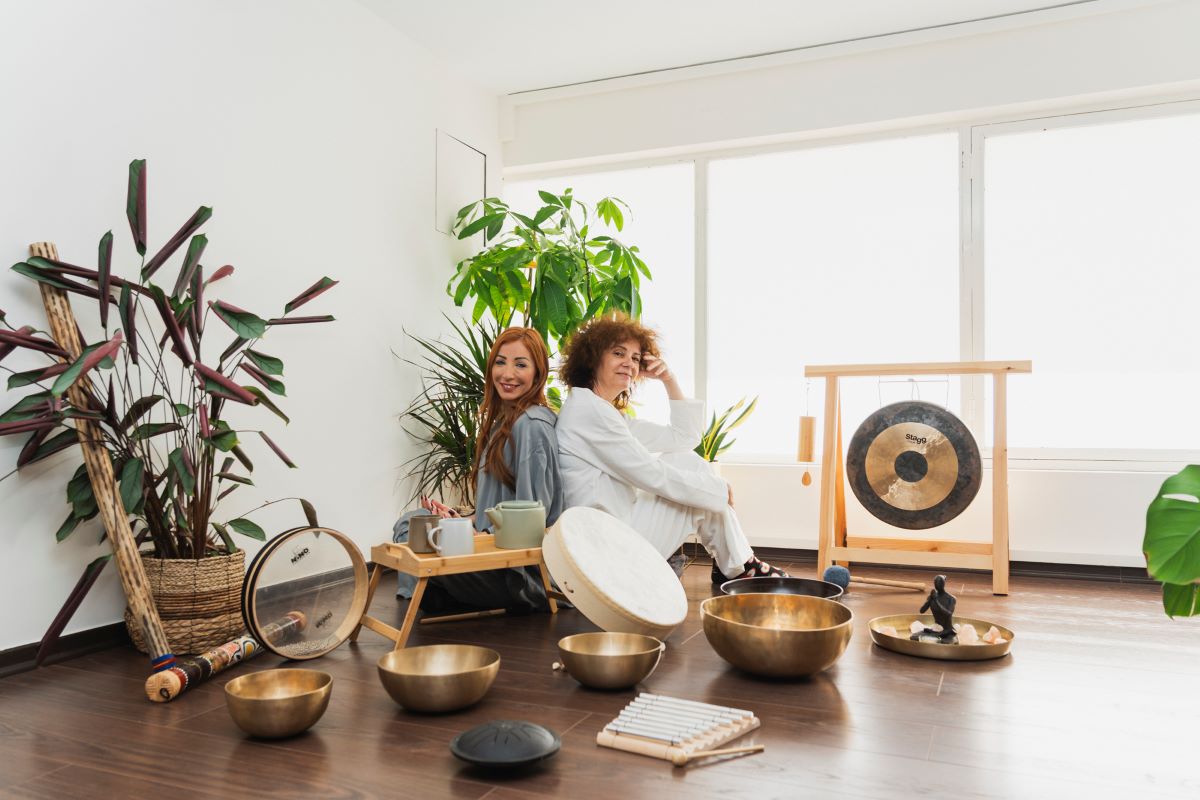 Καθ’ όλη τη διάρκεια της συνάντησης, ακούμε χαλαρωτικούς ήχους από ένα μεγάλο gong, θιβετιανά singing bowls, chimes, drums, monochord, rainstick και άλλα ηχητικά όργανα που υπάρχουν στην αίθουσα. Η Νατάσα (sound journey practitioner) τα χτυπάει με μαλέτες -έτσι λέγονται οι ξύλινοι ράβδοι- με διαφορετικό κάθε φορά τρόπο. Κάποιος ήχος είναι πιο δυνατός, κάποιος με μεγαλύτερη διάρκεια. Κάποιος με κάνει να αισθάνομαι δυνατή και άλλος χαλαρή. Όπως μας ενημερώνει, οι δονήσεις αυτού του Sound Bath δρουν άμεσα στο νευρικό σύστημα, βοηθώντας το σώμα να απελευθερώσει την ένταση και να μπει σε μια κατάσταση βαθιάς χαλάρωσης και εσωτερικής αρμονίας.