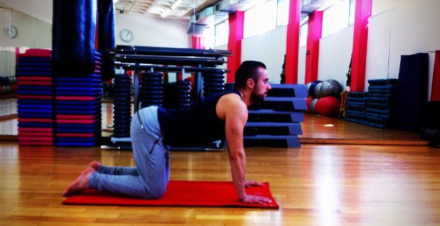 Καθόμαστε στα τέσσερα με τους καρπούς ακριβώς κάτω από τους ώμους (αγκώνες ίσιοι) και τους γοφούς ακριβώς πάνω από τα γόνατα. Με την εκπνοή ενεργοποιούμε τους ραχιαίους, στρέφουμε τη λεκάνη προς τα έξω, ανεβάζουμε ψηλά τον κόκκυγα, κρατάμε τους αγκώνες ίσιους, ωθούμε τις ωμοπλάτες προς τα έξω, επιμηκύνουμε αυχένα και ανεβάζουμε ψηλά το κεφάλι και το βλέμμα.
