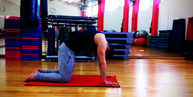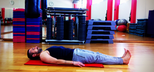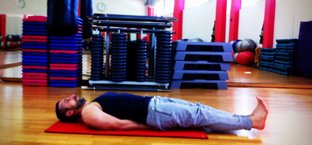 Ξαπλωμένοι στο πάτωμα κάνουμε γροθιές τα χέρια μας και τα τοποθετούμε κάτω απο την λεκάνη μας για αν αποφύγουμε τον τραυματισμό στην μέση. Τα πόδια μας είναι τεντωμένα και ενεργοποιημένα.
