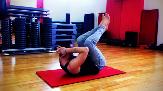 Από ξαπλωμένη θέση στην εισπνοή σας ενεργοποιώντας τους μυς των κοιλιακών σας, σηκώστε τον κορμό σας και ταυτόχρονα τα πόδια σας (λυγισμένα ή τεντωμένα ), προσπαθώντας να ισορροπήσετε στην λεκάνη σας, ελαφρώς προς το πίσω μέρος των γλουτιαίων οστών.