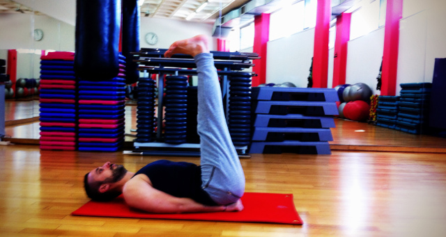Στην εκπνοή τα σηκώνουμε αργά προς τα πάνω μέχρι να σχηματίσουν μια ορθή γωνία και στην εισπνοή με τον ίδιο αργό ρυθμό τα ξαναφέρνουμε στην αρχική τους θέση. Αν υπάρχει πρόβλημα στην περιοχή της μέσης καλό θα ήταν να έχετε λυγισμένα γόνατα. Επαναλάβετε 30-45 φορές με διάλειμμα κάθε 10-15 επαναλήψεις.