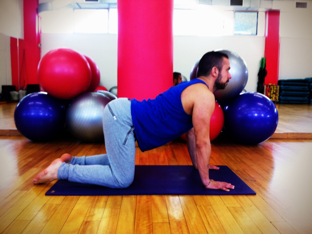 Πώς να την κάνετε: Καθόμαστε στα τέσσερα με τους καρπούς ακριβώς κάτω από τους ώμους (αγκώνες ίσιοι) και τους γοφούς ακριβώς πάνω από τα γόνατα. Με την εισπνοή ενεργοποιούμε τους ραχιαίους, στρέφουμε τη λεκάνη προς τα έξω, ανεβάζουμε ψηλά τον κόκκυγα, κρατάμε τους αγκώνες ίσιους, ωθούμε τις ωμοπλάτες προς τα έξω, επιμηκύνουμε αυχένα και ανεβάζουμε ψηλά το κεφάλι και το βλέμμα. Εκπνέοντας ανασηκώνουμε τη ράχη σπόνδυλο-σπόνδυλο και φέρνουμε το πηγούνι κοντά στο στέρνο. Τελειώνοντας την εκπνοή τραβάμε μέσα τον αφαλό κοντά στη σπονδυλική στήλη και φέρνουμε μέσα τον κόκκυγα.