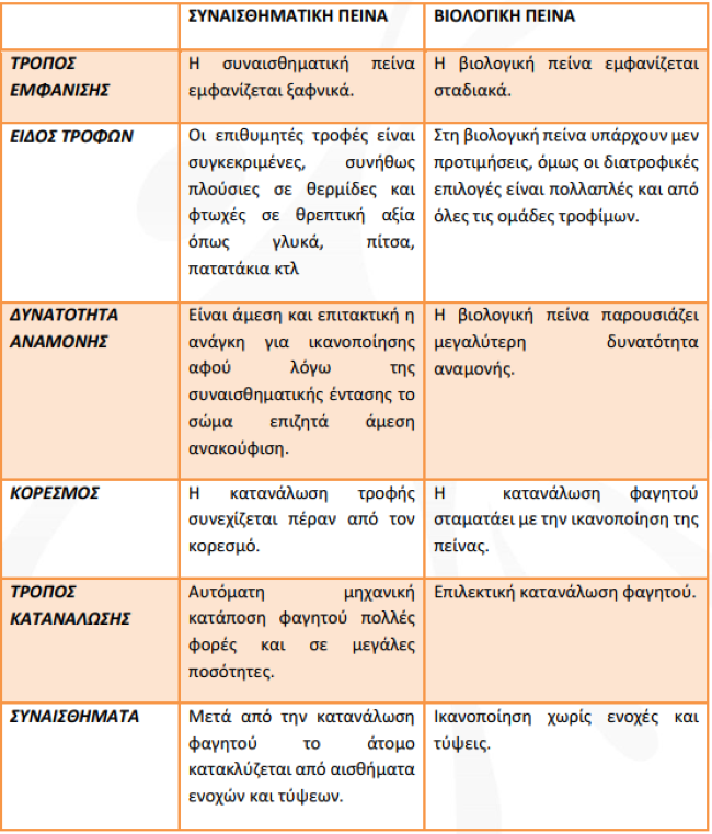 Αυτές τις ημέρες της καραντίνας λοιπόν, είναι πολύ σημαντικό να προσέχουμε τη διατροφή μας, όχι μόνο για λόγους αισθητικούς, αλλά προπαντός για λόγους υγείας. Μεγάλο πρόβλημα του αναγκαίου #menoumespiti είναι το συναισθηματικό φαγητό, δηλαδή η πρόσληψη τροφής, σε απάντηση ψυχολογικών καταστάσεων, άγχος, ανία κ.α. Το πρώτο και βασικό πράγμα που πρέπει να κάνετε είναι να διαχωρίσετε τη βιολογική πείνα από τη συναισθηματική. Προσπαθήστε να ξεχωρίσετε στο μυαλό σας τις φορές που τρώτε επειδή πεινάτε πραγματικά και τις φορές που τρώτε επειδή πχ βαριέστε. Η συναισθηματική πείνα και η βιολογική πείνα διαφέρουν σε αρκετά σημεία. Ο πίνακας που ακολουθεί βοηθάει στον διαχωρισμό τους.