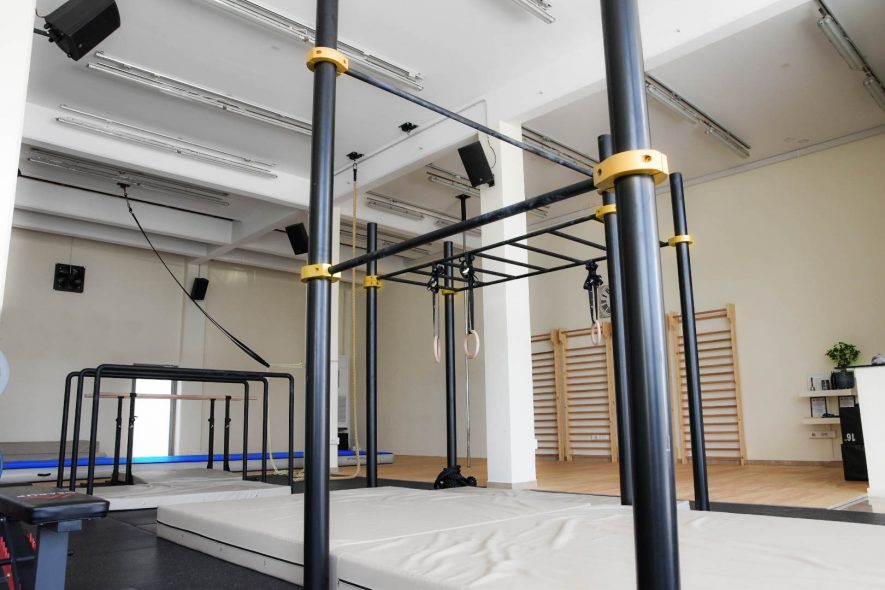 Τα προγράμματα πάντως δεν σταματούν στο πλήρως εξοπλισμένο γυμναστήριο του ισογείου. Ανεβαίνοντας στον πρώτο όροφο, οι ρυθμοί πέφτουν και η ενέργεια του χώρου μοιάζει να αλλάζει. Το ξύλο κυριαρχεί, ο εξοπλισμός περιορίζεται σε πολύζυγα τοίχου και στρώματα, όλη η αίθουσα αποπνέει μια ηρεμία. Εδώ είναι ο χώρος όπου η Ηλέκτρα διδάσκει τα δύο αγαπημένα της μαθήματα, το Hand Balancing και το Active Flexibility. «Έχουμε ξεχωρίσει από την Καλλισθενική -που έχει ένα τεράστιο ασκησιολόγιο- τρία κομμάτια της και έχουμε ενσωματώσει στο πρόγραμμα μαθήματα αφιερωμένα σε αυτά. Το Hand balancing, το Dynamic Flexibility και το Static and Dynamic Strength. Τα δύο πρώτα τα διδάσκω εγώ, συνήθως σε αυτόν τον χώρο του πρώτου ορόφου. Το Hand Balancing αφορά την κατακόρυφο και τις παραλλαγές της. Στηρίξεις στα χέρια δηλαδή! Πρόκειται για ένα σημαντικό κομμάτι της Καλλισθενικής που είναι πολύ αγαπητό και θέλω να του δίνεται η έμφαση που του αρμόζει και να μαθαίνεται σωστά. Από την άλλη, στο Active Flexibility (Δυναμική Ευλυγισία) δίνεται έμφαση στην κινησιολογία, την ιδιοδεκτικότητα και την ισορροπία. Δεν θα κερδίσεις μόνο ευλυγισία, αλλά και δύναμη ταυτόχρονα! Άλλο είναι να κάνεις διάταση πιάνοντας το ένα πόδι με τα χέρια σου και φέρνοντάς το ψηλά και άλλο να φέρεις το πόδι ψηλά και να το κρατήσεις χωρίς τη βοήθεια των χεριών. Αυτό είναι δυναμική ευλυγισία, το πρώτο είναι παθητική».