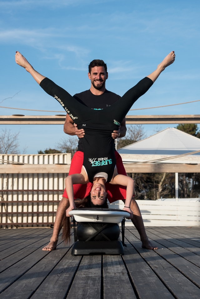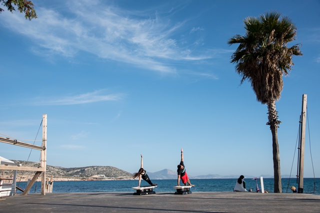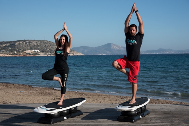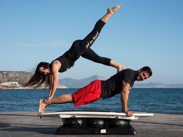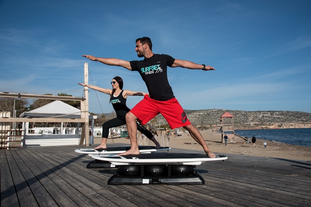 Μετά το flamingo, αφήσαμε ήσυχο το ζωικό βασίλειο και περάσαμε σε ασκήσεις yoga. Οι απανταχού Yogi, όπως με ενημέρωσε ο Γιάννης, έχουν λατρέψει το Surfset, αφού η Yoga, έχει ως βάση την ισορροπία και το Surfset γίνεται το κατάλληλο εργαλείο για να ενεργοποιήσεις την ισορροπία σου και να εξελίξεις τις επιδόσεις σου στην yoga, το pilates και όχι μόνο! Αλλά και πολλές σχολές σερφ στο εξωτερικό επιλέγουν το Surfset για προπόνηση στην ξηρά, αφού η σανίδα του Surfset είναι ένας προσομοιωτής της σανίδας του σερφ, πολύ κοντά σε κίνηση και αίσθηση. Αυτά ακούω και τρελαίνομαι! Καημό το είχα, κοτζάμ Νότια να μην μπορώ να κάνω surf.